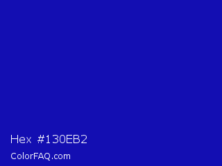 Hex #130eb2 Color is a normal indigo color and the nearest color is Zaffre #0014a8. Hex code #130eb2 and RGB value is rgb(19,14,178). In RGB color space, this color is composed of 7% red, 5% green, 70% blue, In CMYK color space, this color is composed of 89% cyan, 92% magenta, 0% yellow , 30% black , In HSL color space, this color has a hue angle of 242° , 85% saturation and 38% lightness.