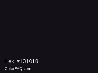 Hex #131018 Color is a almost black violet color and the nearest color is Cinder #0e0e18. Hex code #131018 and RGB value is rgb(19,16,24). In RGB color space, this color is composed of 7% red, 6% green, 9% blue, In CMYK color space, this color is composed of 21% cyan, 33% magenta, 0% yellow , 91% black , In HSL color space, this color has a hue angle of 263° , 20% saturation and 8% lightness.