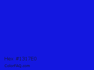 Hex #1317e0 Color is a normal blue color and the nearest color is Bluebonnet #1c1cf0. Hex code #1317e0 and RGB value is rgb(19,23,224). In RGB color space, this color is composed of 7% red, 9% green, 88% blue, In CMYK color space, this color is composed of 92% cyan, 90% magenta, 0% yellow , 12% black , In HSL color space, this color has a hue angle of 239° , 84% saturation and 48% lightness.