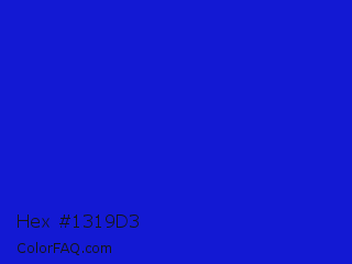 Hex #1319d3 Color is a normal blue color and the nearest color is Bluebonnet #1c1cf0. Hex code #1319d3 and RGB value is rgb(19,25,211). In RGB color space, this color is composed of 7% red, 10% green, 83% blue, In CMYK color space, this color is composed of 91% cyan, 88% magenta, 0% yellow , 17% black , In HSL color space, this color has a hue angle of 238° , 83% saturation and 45% lightness.