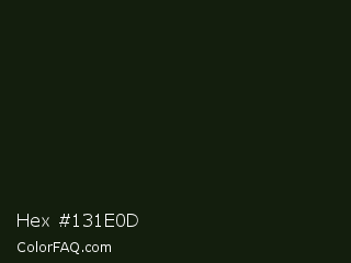 Hex #131e0d Color is a almost black green color and the nearest color is Hunter Green #161d10. Hex code #131e0d and RGB value is rgb(19,30,13). In RGB color space, this color is composed of 7% red, 12% green, 5% blue, In CMYK color space, this color is composed of 37% cyan, 0% magenta, 57% yellow , 88% black , In HSL color space, this color has a hue angle of 99° , 40% saturation and 8% lightness.
