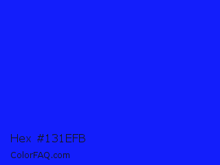 Hex #131efb Color is a normal blue color and the nearest color is Bluebonnet #1c1cf0. Hex code #131efb and RGB value is rgb(19,30,251). In RGB color space, this color is composed of 7% red, 12% green, 98% blue, In CMYK color space, this color is composed of 92% cyan, 88% magenta, 0% yellow , 2% black , In HSL color space, this color has a hue angle of 237° , 97% saturation and 53% lightness.