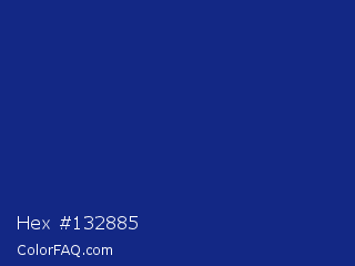 Hex #132885 Color is a dark blue color and the nearest color is Jacksons Purple #20208d. Hex code #132885 and RGB value is rgb(19,40,133). In RGB color space, this color is composed of 7% red, 16% green, 52% blue, In CMYK color space, this color is composed of 86% cyan, 70% magenta, 0% yellow , 48% black , In HSL color space, this color has a hue angle of 229° , 75% saturation and 30% lightness.