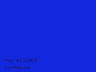 Hex #1328df Color is a normal blue color and the nearest color is Bluebonnet #1c1cf0. Hex code #1328df and RGB value is rgb(19,40,223). In RGB color space, this color is composed of 7% red, 16% green, 87% blue, In CMYK color space, this color is composed of 91% cyan, 82% magenta, 0% yellow , 13% black , In HSL color space, this color has a hue angle of 234° , 84% saturation and 47% lightness.