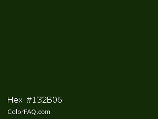 Hex #132b06 Color is a very dark green color and the nearest color is Deep Forest Green #182d09. Hex code #132b06 and RGB value is rgb(19,43,6). In RGB color space, this color is composed of 7% red, 17% green, 2% blue, In CMYK color space, this color is composed of 56% cyan, 0% magenta, 86% yellow , 83% black , In HSL color space, this color has a hue angle of 99° , 76% saturation and 10% lightness.
