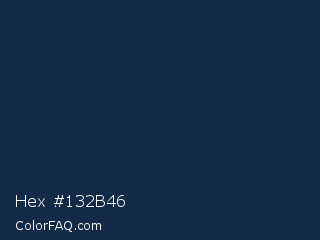 Hex #132b46 Color is a very dark blue color and the nearest color is Big Stone #162a40. Hex code #132b46 and RGB value is rgb(19,43,70). In RGB color space, this color is composed of 7% red, 17% green, 27% blue, In CMYK color space, this color is composed of 73% cyan, 39% magenta, 0% yellow , 73% black , In HSL color space, this color has a hue angle of 212° , 57% saturation and 17% lightness.