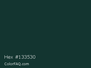 Hex #133530 Color is a very dark cyan color and the nearest color is Gable Green #163531. Hex code #133530 and RGB value is rgb(19,53,48). In RGB color space, this color is composed of 7% red, 21% green, 19% blue, In CMYK color space, this color is composed of 64% cyan, 0% magenta, 9% yellow , 79% black , In HSL color space, this color has a hue angle of 171° , 47% saturation and 14% lightness.