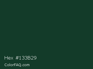 Hex #133b29 Color is a very dark green color and the nearest color is Phthalo Green #123524. Hex code #133b29 and RGB value is rgb(19,59,41). In RGB color space, this color is composed of 7% red, 23% green, 16% blue, In CMYK color space, this color is composed of 68% cyan, 0% magenta, 31% yellow , 77% black , In HSL color space, this color has a hue angle of 153° , 51% saturation and 15% lightness.