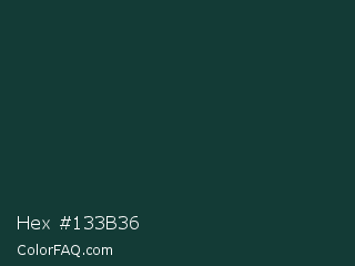 Hex #133b36 Color is a very dark cyan color and the nearest color is Gable Green #163531. Hex code #133b36 and RGB value is rgb(19,59,54). In RGB color space, this color is composed of 7% red, 23% green, 21% blue, In CMYK color space, this color is composed of 68% cyan, 0% magenta, 8% yellow , 77% black , In HSL color space, this color has a hue angle of 173° , 51% saturation and 15% lightness.