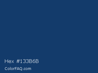 Hex #133b6b Color is a dark blue color and the nearest color is Biscay #1b3162. Hex code #133b6b and RGB value is rgb(19,59,107). In RGB color space, this color is composed of 7% red, 23% green, 42% blue, In CMYK color space, this color is composed of 82% cyan, 45% magenta, 0% yellow , 58% black , In HSL color space, this color has a hue angle of 213° , 70% saturation and 25% lightness.
