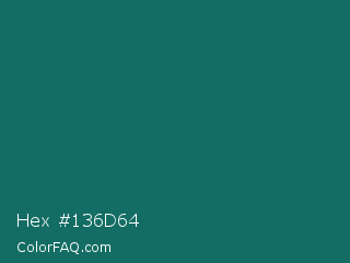 Hex #136d64 Color is a dark cyan color and the nearest color is Genoa #15736b. Hex code #136d64 and RGB value is rgb(19,109,100). In RGB color space, this color is composed of 7% red, 43% green, 39% blue, In CMYK color space, this color is composed of 83% cyan, 0% magenta, 8% yellow , 57% black , In HSL color space, this color has a hue angle of 174° , 70% saturation and 25% lightness.