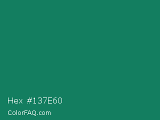 Hex #137e60 Color is a dark green color and the nearest color is Deep Green Cyan Turquoise #0e7c61. Hex code #137e60 and RGB value is rgb(19,126,96). In RGB color space, this color is composed of 7% red, 49% green, 38% blue, In CMYK color space, this color is composed of 85% cyan, 0% magenta, 24% yellow , 51% black , In HSL color space, this color has a hue angle of 163° , 74% saturation and 28% lightness.
