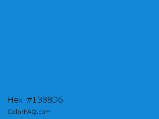 Hex #1388d6 Color is a normal blue color and the nearest color is Rich Electric Blue #0892d0. Hex code #1388d6 and RGB value is rgb(19,136,214). In RGB color space, this color is composed of 7% red, 53% green, 84% blue, In CMYK color space, this color is composed of 91% cyan, 36% magenta, 0% yellow , 16% black , In HSL color space, this color has a hue angle of 204° , 84% saturation and 46% lightness.