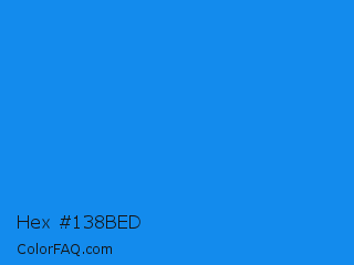Hex #138bed Color is a normal blue color and the nearest color is Dodger Blue #1e90ff. Hex code #138bed and RGB value is rgb(19,139,237). In RGB color space, this color is composed of 7% red, 55% green, 93% blue, In CMYK color space, this color is composed of 92% cyan, 41% magenta, 0% yellow , 7% black , In HSL color space, this color has a hue angle of 207° , 86% saturation and 50% lightness.