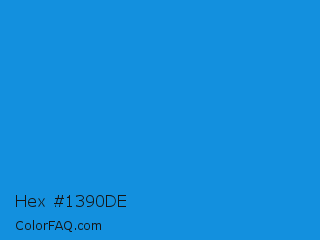 Hex #1390de Color is a normal blue color and the nearest color is Rich Electric Blue #0892d0. Hex code #1390de and RGB value is rgb(19,144,222). In RGB color space, this color is composed of 7% red, 56% green, 87% blue, In CMYK color space, this color is composed of 91% cyan, 35% magenta, 0% yellow , 13% black , In HSL color space, this color has a hue angle of 203° , 84% saturation and 47% lightness.