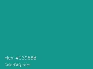 Hex #13988b Color is a normal cyan color and the nearest color is Niagara #06a189. Hex code #13988b and RGB value is rgb(19,152,139). In RGB color space, this color is composed of 7% red, 60% green, 55% blue, In CMYK color space, this color is composed of 88% cyan, 0% magenta, 9% yellow , 40% black , In HSL color space, this color has a hue angle of 174° , 78% saturation and 34% lightness.