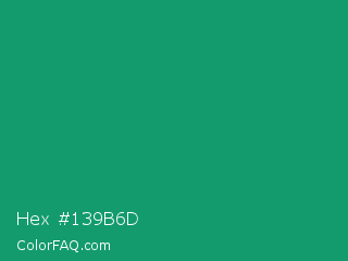 Hex #139b6d Color is a normal green color and the nearest color is Green NCS #009f6b. Hex code #139b6d and RGB value is rgb(19,155,109). In RGB color space, this color is composed of 7% red, 61% green, 43% blue, In CMYK color space, this color is composed of 88% cyan, 0% magenta, 30% yellow , 39% black , In HSL color space, this color has a hue angle of 160° , 78% saturation and 34% lightness.