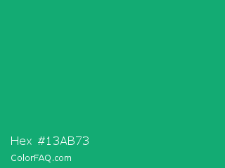 Hex #13ab73 Color is a normal green color and the nearest color is Green Crayola #1cac78. Hex code #13ab73 and RGB value is rgb(19,171,115). In RGB color space, this color is composed of 7% red, 67% green, 45% blue, In CMYK color space, this color is composed of 89% cyan, 0% magenta, 33% yellow , 33% black , In HSL color space, this color has a hue angle of 158° , 80% saturation and 37% lightness.