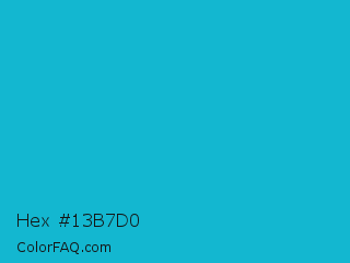 Hex #13b7d0 Color is a normal cyan color and the nearest color is Battery Charged Blue #1dacd6. Hex code #13b7d0 and RGB value is rgb(19,183,208). In RGB color space, this color is composed of 7% red, 72% green, 82% blue, In CMYK color space, this color is composed of 91% cyan, 12% magenta, 0% yellow , 18% black , In HSL color space, this color has a hue angle of 188° , 83% saturation and 45% lightness.