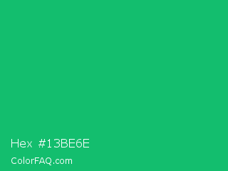 Hex #13be6e Color is a normal green color and the nearest color is Green Crayola #1cac78. Hex code #13be6e and RGB value is rgb(19,190,110). In RGB color space, this color is composed of 7% red, 75% green, 43% blue, In CMYK color space, this color is composed of 90% cyan, 0% magenta, 42% yellow , 25% black , In HSL color space, this color has a hue angle of 152° , 82% saturation and 41% lightness.