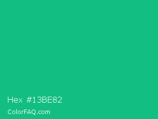 Hex #13be82 Color is a normal green color and the nearest color is Mountain Meadow Crayola #1ab385. Hex code #13be82 and RGB value is rgb(19,190,130). In RGB color space, this color is composed of 7% red, 75% green, 51% blue, In CMYK color space, this color is composed of 90% cyan, 0% magenta, 32% yellow , 25% black , In HSL color space, this color has a hue angle of 159° , 82% saturation and 41% lightness.