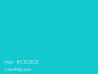 Hex #13c8ce Color is a normal cyan color and the nearest color is Java #1fc2c2. Hex code #13c8ce and RGB value is rgb(19,200,206). In RGB color space, this color is composed of 7% red, 78% green, 81% blue, In CMYK color space, this color is composed of 91% cyan, 3% magenta, 0% yellow , 19% black , In HSL color space, this color has a hue angle of 182° , 83% saturation and 44% lightness.
