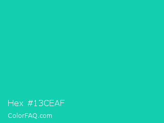 Hex #13ceaf Color is a normal cyan color and the nearest color is Amazonite #00c4b0. Hex code #13ceaf and RGB value is rgb(19,206,175). In RGB color space, this color is composed of 7% red, 81% green, 69% blue, In CMYK color space, this color is composed of 91% cyan, 0% magenta, 15% yellow , 19% black , In HSL color space, this color has a hue angle of 170° , 83% saturation and 44% lightness.