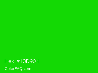 Hex #13d904 Color is a normal green color and the nearest color is Green #00ff00. Hex code #13d904 and RGB value is rgb(19,217,4). In RGB color space, this color is composed of 7% red, 85% green, 2% blue, In CMYK color space, this color is composed of 91% cyan, 0% magenta, 98% yellow , 15% black , In HSL color space, this color has a hue angle of 116° , 96% saturation and 43% lightness.