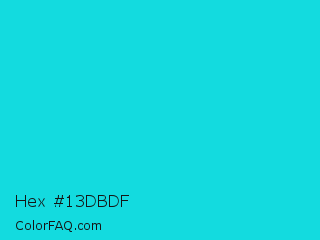 Hex #13dbdf Color is a normal cyan color and the nearest color is Bright Turquoise #08e8de. Hex code #13dbdf and RGB value is rgb(19,219,223). In RGB color space, this color is composed of 7% red, 86% green, 87% blue, In CMYK color space, this color is composed of 91% cyan, 2% magenta, 0% yellow , 13% black , In HSL color space, this color has a hue angle of 181° , 84% saturation and 47% lightness.