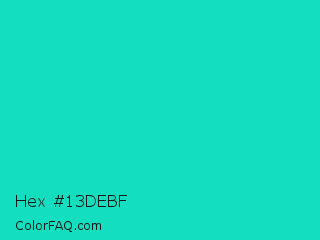 Hex #13debf Color is a normal cyan color and the nearest color is Robins Egg Blue #00cccc. Hex code #13debf and RGB value is rgb(19,222,191). In RGB color space, this color is composed of 7% red, 87% green, 75% blue, In CMYK color space, this color is composed of 91% cyan, 0% magenta, 14% yellow , 13% black , In HSL color space, this color has a hue angle of 171° , 84% saturation and 47% lightness.