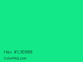 Hex #13e888 Color is a normal green color and the nearest color is Spring Green #00ff7f. Hex code #13e888 and RGB value is rgb(19,232,136). In RGB color space, this color is composed of 7% red, 91% green, 53% blue, In CMYK color space, this color is composed of 92% cyan, 0% magenta, 41% yellow , 9% black , In HSL color space, this color has a hue angle of 153° , 85% saturation and 49% lightness.
