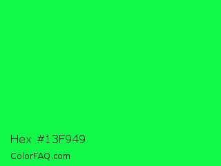Hex #13f949 Color is a normal green color and the nearest color is Malachite #0bda51. Hex code #13f949 and RGB value is rgb(19,249,73). In RGB color space, this color is composed of 7% red, 98% green, 29% blue, In CMYK color space, this color is composed of 92% cyan, 0% magenta, 71% yellow , 2% black , In HSL color space, this color has a hue angle of 134° , 95% saturation and 53% lightness.
