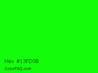 Hex #13fd0b Color is a normal green color and the nearest color is Green #00ff00. Hex code #13fd0b and RGB value is rgb(19,253,11). In RGB color space, this color is composed of 7% red, 99% green, 4% blue, In CMYK color space, this color is composed of 92% cyan, 0% magenta, 96% yellow , 1% black , In HSL color space, this color has a hue angle of 118° , 98% saturation and 52% lightness.