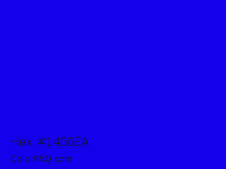 Hex #1400ea Color is a normal indigo color and the nearest color is Blue #0000ff. Hex code #1400ea and RGB value is rgb(20,0,234). In RGB color space, this color is composed of 8% red, 0% green, 92% blue, In CMYK color space, this color is composed of 91% cyan, 100% magenta, 0% yellow , 8% black , In HSL color space, this color has a hue angle of 245° , 100% saturation and 46% lightness.