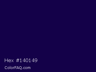 Hex #140149 Color is a very dark indigo color and the nearest color is Tolopea #1b0245. Hex code #140149 and RGB value is rgb(20,1,73). In RGB color space, this color is composed of 8% red, 0% green, 29% blue, In CMYK color space, this color is composed of 73% cyan, 99% magenta, 0% yellow , 71% black , In HSL color space, this color has a hue angle of 256° , 97% saturation and 15% lightness.