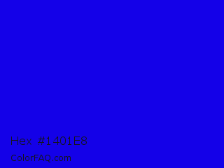Hex #1401e8 Color is a normal indigo color and the nearest color is Bluebonnet #1c1cf0. Hex code #1401e8 and RGB value is rgb(20,1,232). In RGB color space, this color is composed of 8% red, 0% green, 91% blue, In CMYK color space, this color is composed of 91% cyan, 100% magenta, 0% yellow , 9% black , In HSL color space, this color has a hue angle of 245° , 99% saturation and 46% lightness.