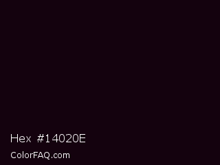 Hex #14020e Color is a almost black magenta color and the nearest color is Asphalt #130a06. Hex code #14020e and RGB value is rgb(20,2,14). In RGB color space, this color is composed of 8% red, 1% green, 5% blue, In CMYK color space, this color is composed of 0% cyan, 90% magenta, 30% yellow , 92% black , In HSL color space, this color has a hue angle of 320° , 82% saturation and 4% lightness.