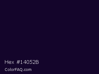 Hex #14052b Color is a almost black violet color and the nearest color is Black Rock #0d0332. Hex code #14052b and RGB value is rgb(20,5,43). In RGB color space, this color is composed of 8% red, 2% green, 17% blue, In CMYK color space, this color is composed of 53% cyan, 88% magenta, 0% yellow , 83% black , In HSL color space, this color has a hue angle of 264° , 79% saturation and 9% lightness.