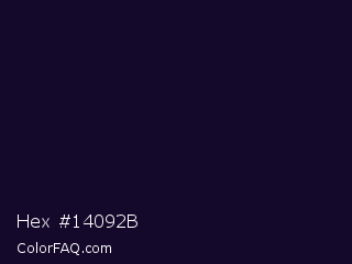 Hex #14092b Color is a very dark indigo color and the nearest color is Black Rock #0d0332. Hex code #14092b and RGB value is rgb(20,9,43). In RGB color space, this color is composed of 8% red, 4% green, 17% blue, In CMYK color space, this color is composed of 53% cyan, 79% magenta, 0% yellow , 83% black , In HSL color space, this color has a hue angle of 259° , 65% saturation and 10% lightness.