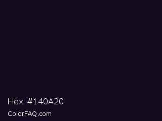 Hex #140a20 Color is a almost black violet color and the nearest color is Deep Ebony #0c0b1d. Hex code #140a20 and RGB value is rgb(20,10,32). In RGB color space, this color is composed of 8% red, 4% green, 13% blue, In CMYK color space, this color is composed of 38% cyan, 69% magenta, 0% yellow , 87% black , In HSL color space, this color has a hue angle of 267° , 52% saturation and 8% lightness.