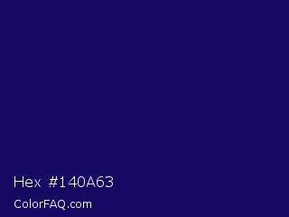 Hex #140a63 Color is a very dark indigo color and the nearest color is Arapawa #110c6c. Hex code #140a63 and RGB value is rgb(20,10,99). In RGB color space, this color is composed of 8% red, 4% green, 39% blue, In CMYK color space, this color is composed of 80% cyan, 90% magenta, 0% yellow , 61% black , In HSL color space, this color has a hue angle of 247° , 82% saturation and 21% lightness.