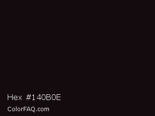 Hex #140b0e Color is a almost black rose color and the nearest color is Smoky Black #100c08. Hex code #140b0e and RGB value is rgb(20,11,14). In RGB color space, this color is composed of 8% red, 4% green, 5% blue, In CMYK color space, this color is composed of 0% cyan, 45% magenta, 30% yellow , 92% black , In HSL color space, this color has a hue angle of 340° , 29% saturation and 6% lightness.