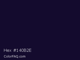 Hex #140b2e Color is a very dark indigo color and the nearest color is Haiti #1b1035. Hex code #140b2e and RGB value is rgb(20,11,46). In RGB color space, this color is composed of 8% red, 4% green, 18% blue, In CMYK color space, this color is composed of 57% cyan, 76% magenta, 0% yellow , 82% black , In HSL color space, this color has a hue angle of 255° , 61% saturation and 11% lightness.