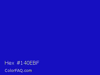 Hex #140ebf Color is a normal indigo color and the nearest color is Dark Blue #0000c8. Hex code #140ebf and RGB value is rgb(20,14,191). In RGB color space, this color is composed of 8% red, 5% green, 75% blue, In CMYK color space, this color is composed of 90% cyan, 93% magenta, 0% yellow , 25% black , In HSL color space, this color has a hue angle of 242° , 86% saturation and 40% lightness.