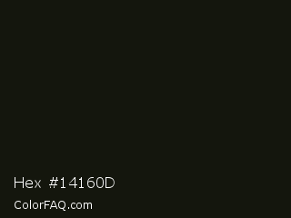 Hex #14160d Color is a almost black lime color and the nearest color is Hunter Green #161d10. Hex code #14160d and RGB value is rgb(20,22,13). In RGB color space, this color is composed of 8% red, 9% green, 5% blue, In CMYK color space, this color is composed of 9% cyan, 0% magenta, 41% yellow , 91% black , In HSL color space, this color has a hue angle of 73° , 26% saturation and 7% lightness.
