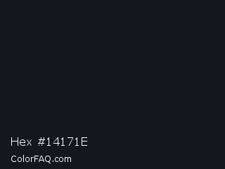 Hex #14171e Color is a very dark blue color and the nearest color is Vulcan #10121d. Hex code #14171e and RGB value is rgb(20,23,30). In RGB color space, this color is composed of 8% red, 9% green, 12% blue, In CMYK color space, this color is composed of 33% cyan, 23% magenta, 0% yellow , 88% black , In HSL color space, this color has a hue angle of 222° , 20% saturation and 10% lightness.