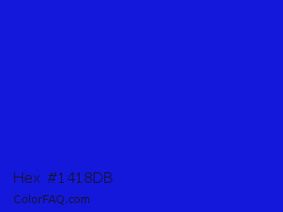 Hex #1418db Color is a normal blue color and the nearest color is Bluebonnet #1c1cf0. Hex code #1418db and RGB value is rgb(20,24,219). In RGB color space, this color is composed of 8% red, 9% green, 86% blue, In CMYK color space, this color is composed of 91% cyan, 89% magenta, 0% yellow , 14% black , In HSL color space, this color has a hue angle of 239° , 83% saturation and 47% lightness.