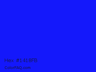 Hex #1418fb Color is a normal blue color and the nearest color is Bluebonnet #1c1cf0. Hex code #1418fb and RGB value is rgb(20,24,251). In RGB color space, this color is composed of 8% red, 9% green, 98% blue, In CMYK color space, this color is composed of 92% cyan, 90% magenta, 0% yellow , 2% black , In HSL color space, this color has a hue angle of 239° , 97% saturation and 53% lightness.