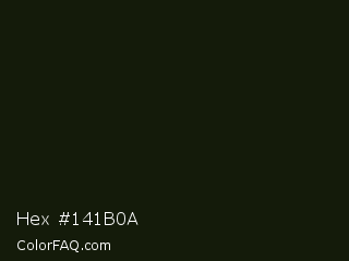 Hex #141b0a Color is a almost black green color and the nearest color is Hunter Green #161d10. Hex code #141b0a and RGB value is rgb(20,27,10). In RGB color space, this color is composed of 8% red, 11% green, 4% blue, In CMYK color space, this color is composed of 26% cyan, 0% magenta, 63% yellow , 89% black , In HSL color space, this color has a hue angle of 85° , 46% saturation and 7% lightness.