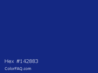 Hex #142883 Color is a dark blue color and the nearest color is St Patricks Blue #23297a. Hex code #142883 and RGB value is rgb(20,40,131). In RGB color space, this color is composed of 8% red, 16% green, 51% blue, In CMYK color space, this color is composed of 85% cyan, 69% magenta, 0% yellow , 49% black , In HSL color space, this color has a hue angle of 229° , 74% saturation and 30% lightness.